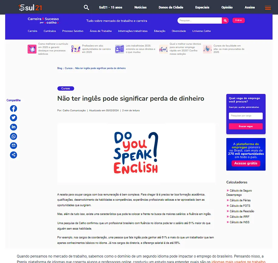 Os maiores portais de notícias do Brasil e do mundo confirmam: dominar o inglês não é só um diferencial, é o que separa um currículo impossível de ignorar de mais um papel amassado no fundo da lixeira. Você escolhe em qual lugar seu currícuo vai parar.