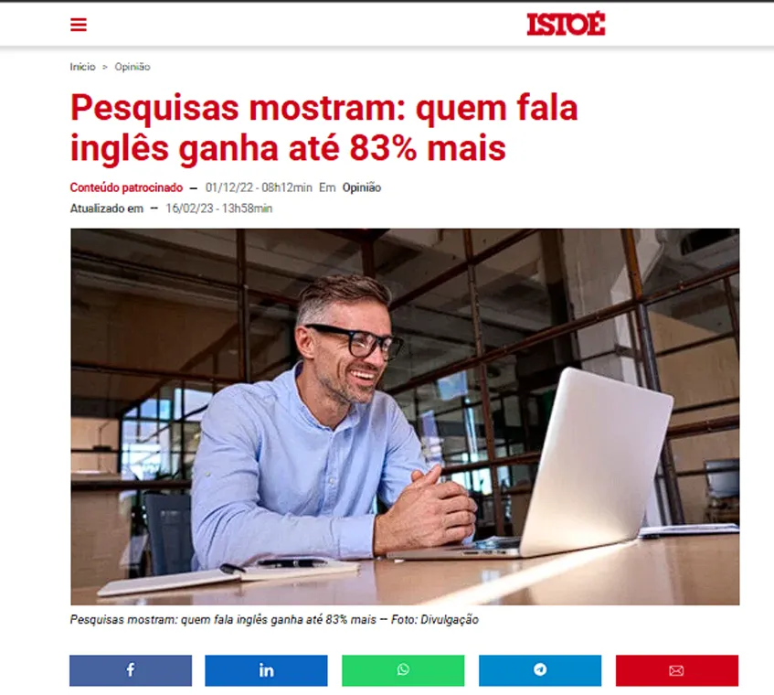 Pode ganhar até 83% mais do que quem não fala inglês fluente, segundo a revista IstoÉ.